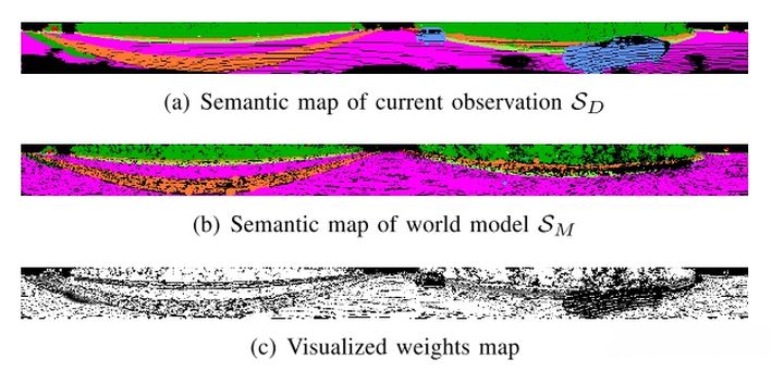 图5. 语义ICP的可视化。(a) 当前帧的语义地图。(b)对应的语义地图。(c)ICP中的加权地图。像素越黑,权重越小。