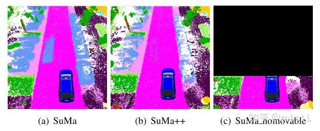 图4. 提出的动态滤除的效果。对于所有图,我们展示了对应编号的颜色,但是注意SuMa没有使用语义信息。(a)由SuMa生成的面元。(b)我们的方法(c)移除所有潜在的动态物体。