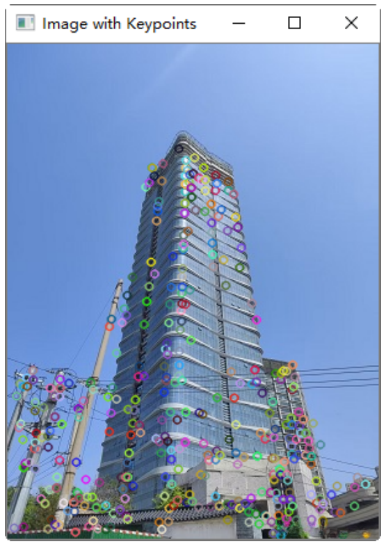 在给定代码中随后读取并加载待处理的图片随后调用extract_sift_features函数来获取该图片的sift特征描述接着在调用该函数的过程中将输入图片转换为灰度制式之后生成相应的sift实例对象随后通过调用detect_and_compute方法能够同时识别出关键点并计算出相应的特征描述子最后一步骤是在输出窗口中展示这些关键点的位置并对它们进行了标记执行效果如图8-1所示