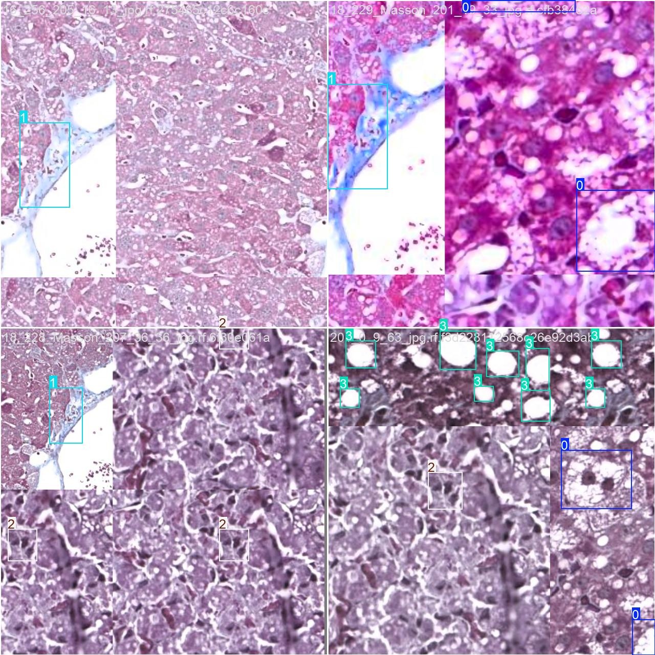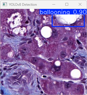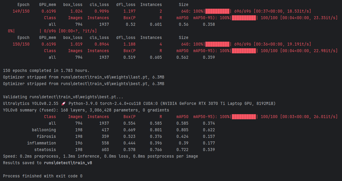 本研究采用了包含多种肝病相关图像的数据集,并借助Labelimg标注工具完成了对每张图像中目标边界框(Bounding Box)及其分类标签的标注工作。在此基础上,主要基于YOLOv8n模型架构开展了一系列模型训练工作,在完成训练后我们对模型在验证集上的性能进行了全面评估与对比分析。具体而言,在整个实验流程中包含了以下三个关键环节:数据准备阶段、模型训练阶段以及模型评估阶段。实验中所涉及的目标分类类别主要包括细胞膨胀性状、纤维化过程、炎症状态以及脂肪肝类型等四个核心指标。根据实验数据显示,在所使用的数据集中总计包含3976张图像样本信息,在具体分布上表现为:用于训练的样本数量为2782张,在验证阶段使用了794张样本,在测试过程中则采用了400张新的样本作为代表进行分析比较