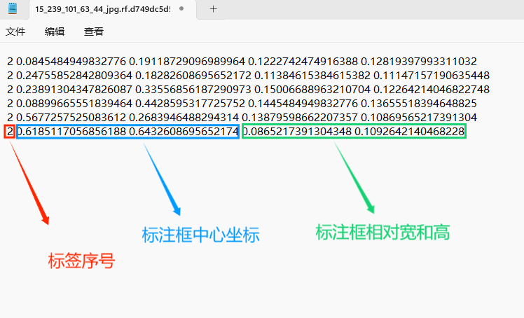 存放标签信息的文件文件名与图片名相同内容则由N行5列的数据构成每一行都对应一个目标具体包括五个字段按顺序排列分别是分类ID中心坐标的X轴与Y轴值以及标注框的宽度与高度