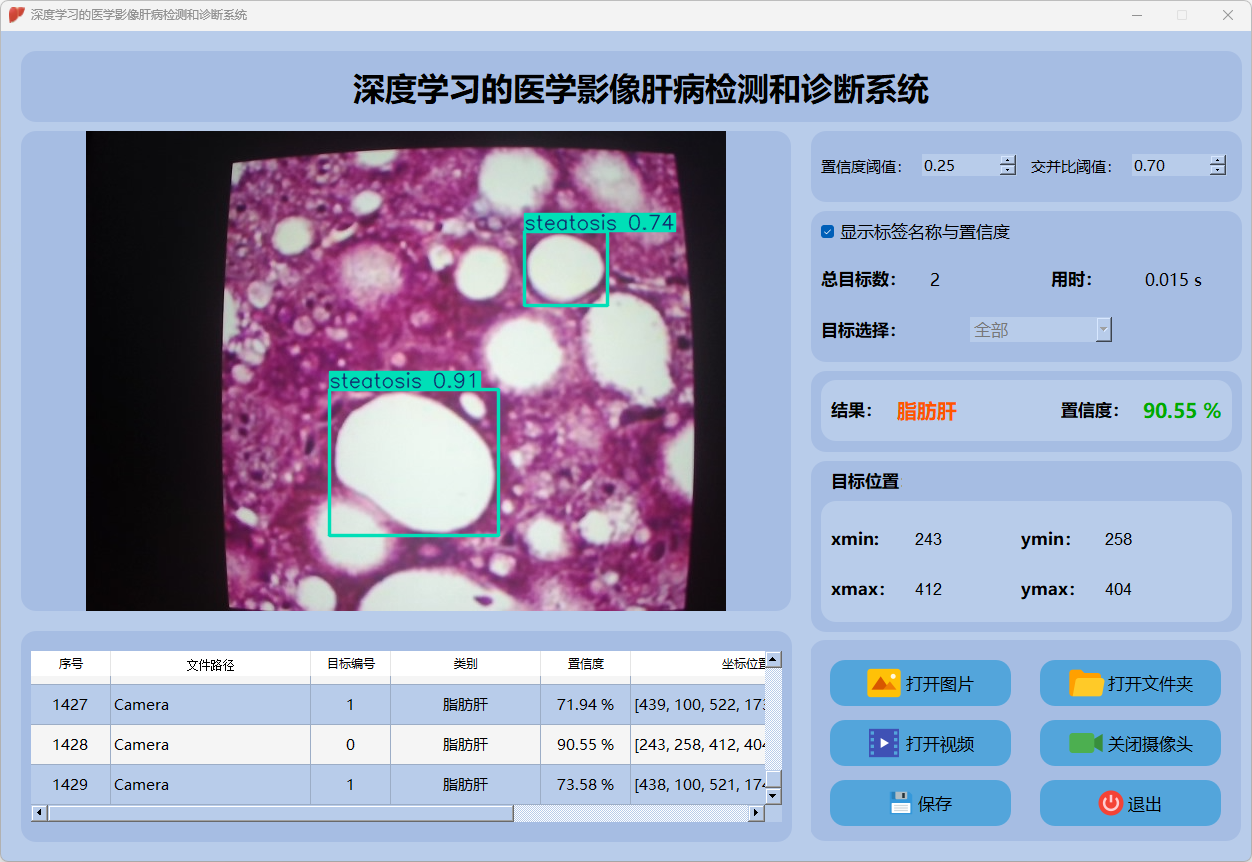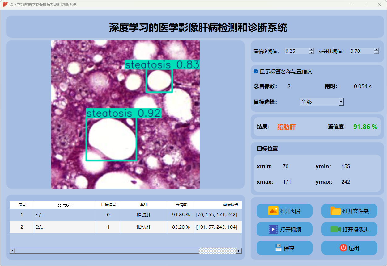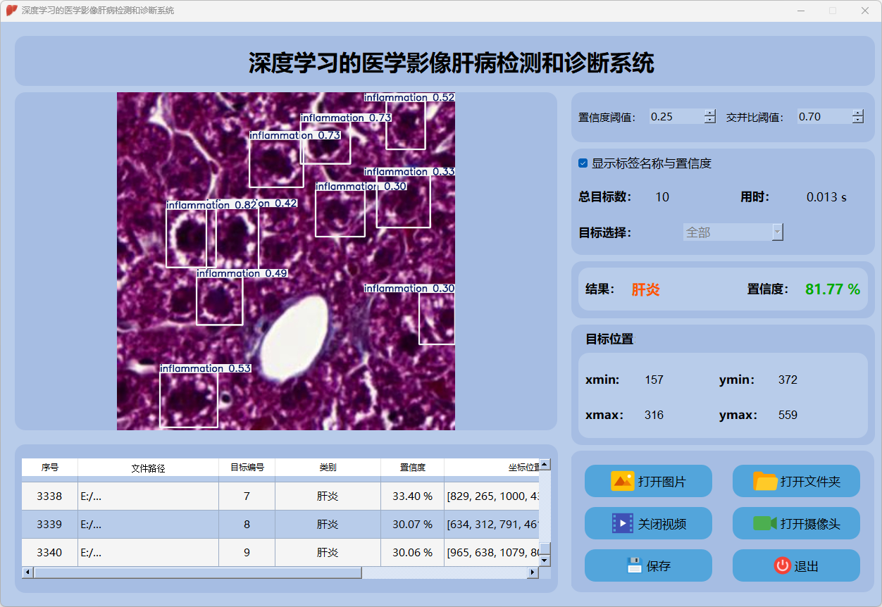 这个界面呈现了系统在视频帧处理时的多目标检测能力。该系统不仅能够准确诊断肝病患者,并能提供详细的检查结果信息以及相应的置信度评分。