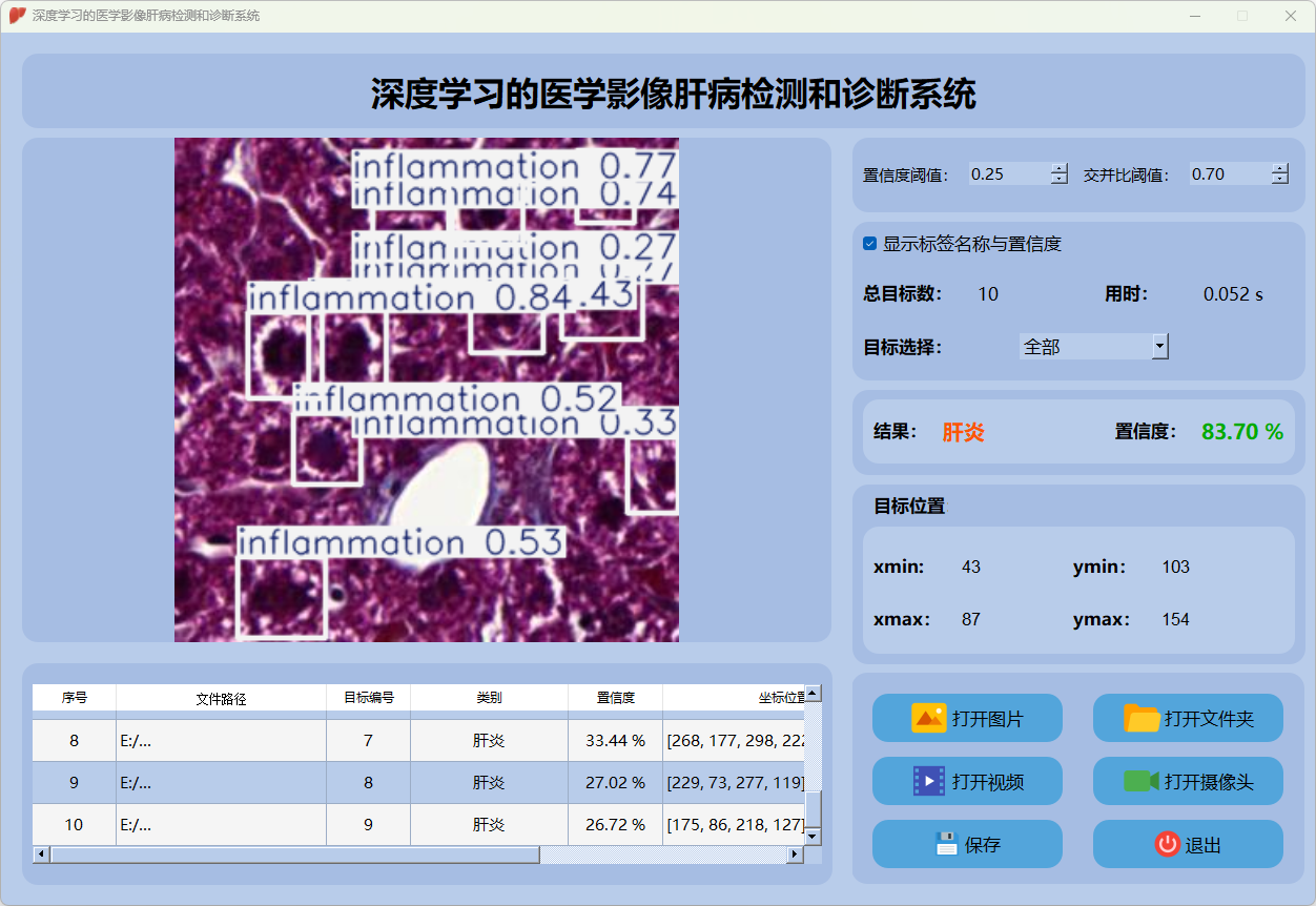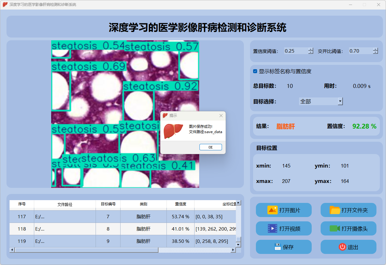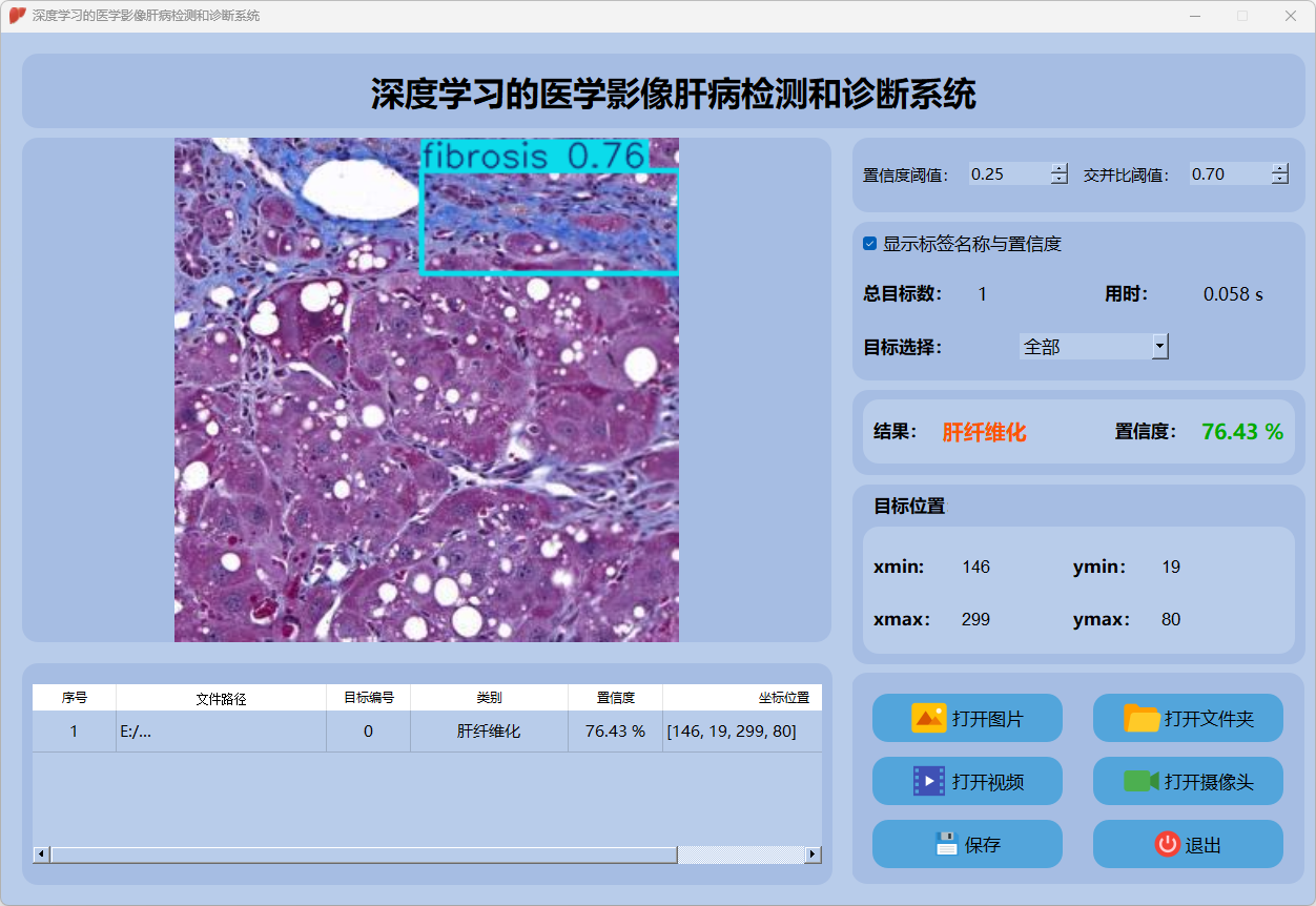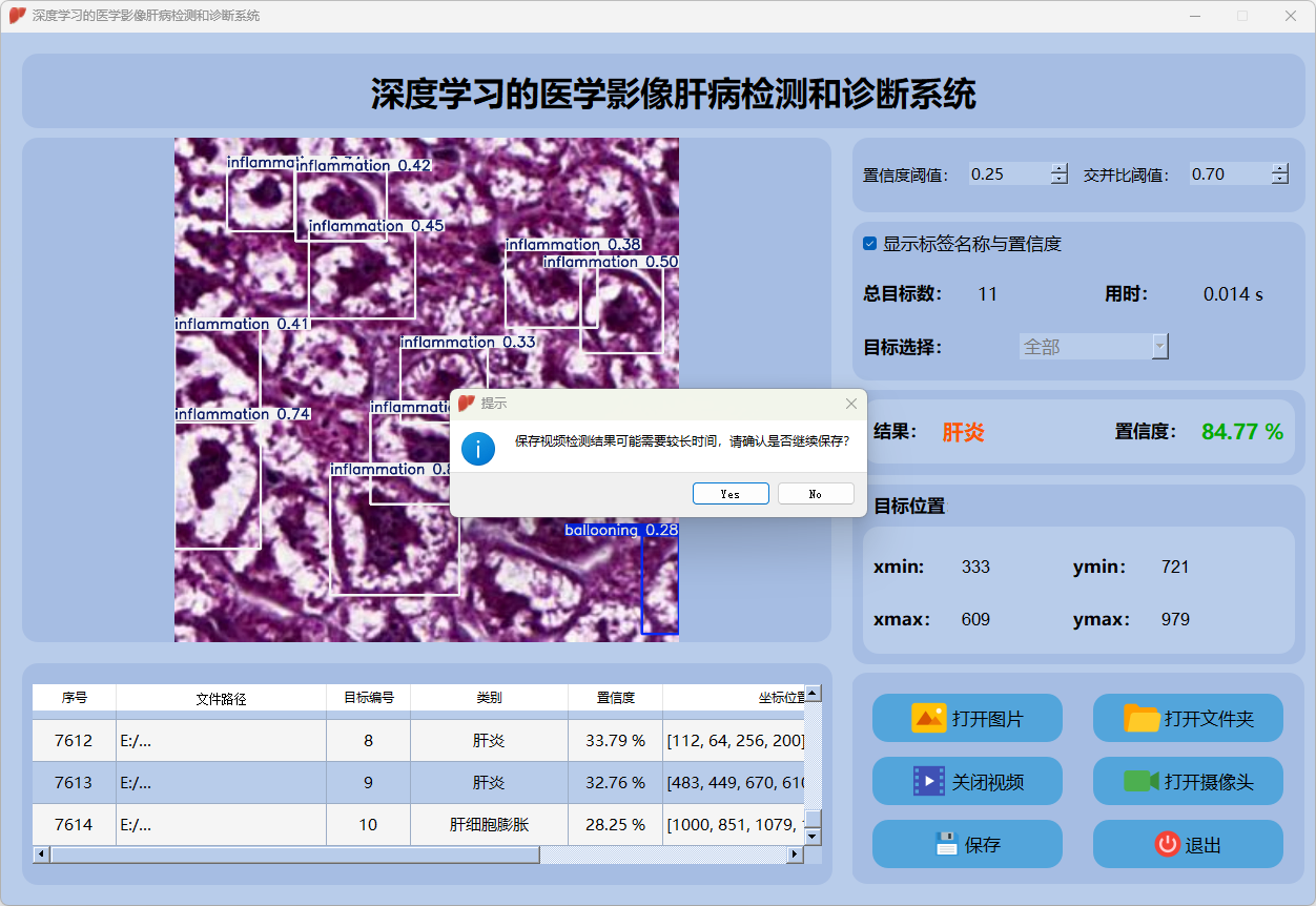 系统对视频进行实时分析,并识别出肝病并呈现检测结果。详细信息表中记录了视频中多个检测结果的置信度及具体位置数据。