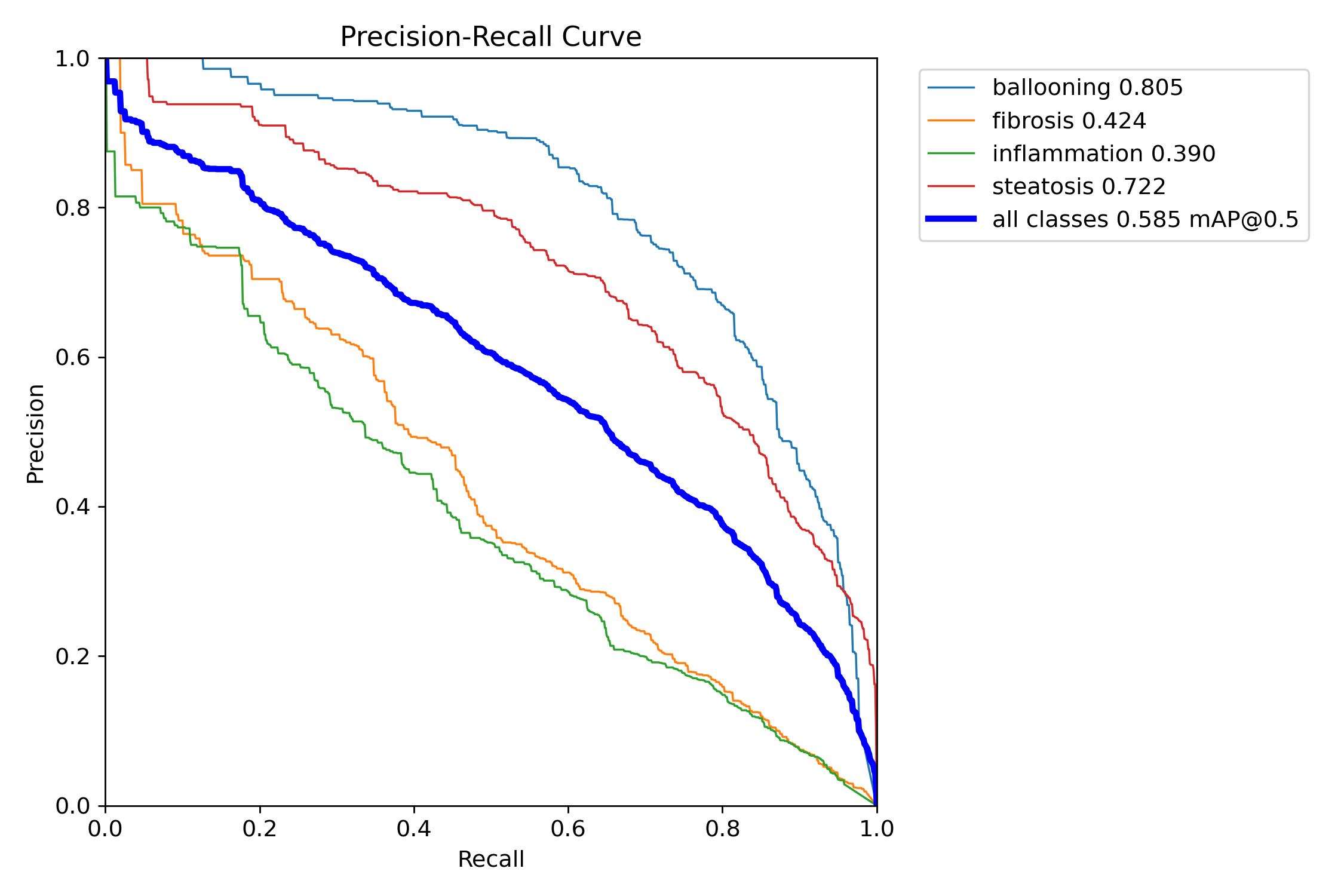 (4)红色曲线代表steatosis类别的检测结果 其平均精度为 0.722 比气球样变对应的蓝色曲线略低