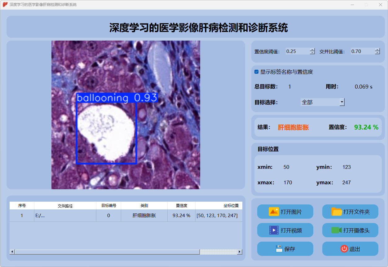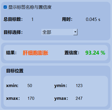 (1)该系统评估检测到的目标类型属于"肝细胞膨胀"类别所得出的置信值为93.24%。