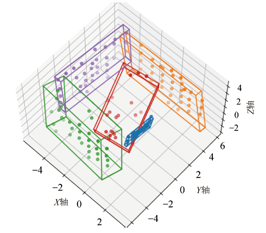 本文对比了包括 K 均值[21](K -Means)、基于密度的噪声应用空间聚类[22](Density-Based Spatial Clustering of Applications with Noise,DBSCAN)、谱聚类[23](Spectral Clustering)和高斯混合模型在内的4种感知数据分割方法,感知数据分割结果如表4所示。利用基于PCA的最小包围框对感知数据分割结果进行环境重构,室内环境重构结果如图10所示。