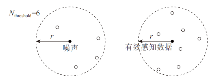 半径滤波的原理如下:对点云中的每一个点pi,确定一个半径为 r 的邻域(即以pi为圆心,以 r 为半径的球体);若邻域范围内的点数 N <N threshold,则认为点pi为噪声点,并去除,如图7所示。