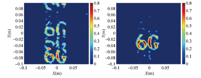 另一方面,为了加快虚拟孔径形成速度,应用基于MIMO的多通道成像算法。多通道成像过程可以被视为来自多个接收通道的电磁信号的时域相干组合。理论上,在相同的成像质量下,n 个接收器可以将采样时间缩短到1 /n 。但由于多通道硬件不一致性,不同接收机通道的增益和时延不平衡产生了重要问题。可使用基于自聚焦的优化算法以搜索并补偿多通道不平衡[6]。多通道不平衡补偿前后结果如图2所示。