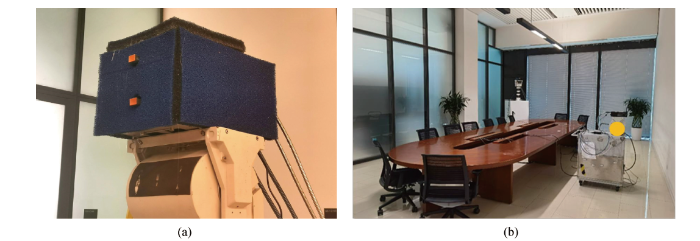 图8通感一体化基站示意图**(a)和设备放置及场景图(b)**