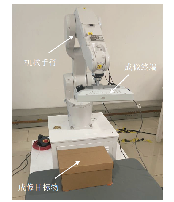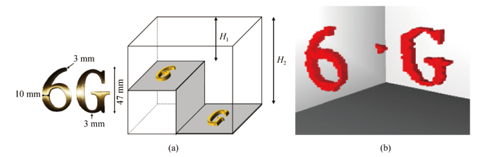 以上两种技术的结合,我们通过图3中的140 GHz的成像设备进行了测试和验证。如图4所示,机械臂以1 m/s的速度扫描,在原型中扫描区域设置为10 cm×12 cm。同时控制扫描轨迹的纵向间距,以模拟用户手持扫描行为轨迹中的稀疏性。对图5(a)中的物体成像结果如图5(b)所示。其中3 mm级别的物体成像效果良好,试验验证以上方案具有较高的分辨率。