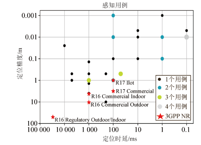 因此多样化的感知业务,也要求了多样化的关键技术。在此同时,3GPP已经启动了一些使用5G空中接口的用例和潜在ISAC要求的初步研究。同时,欧洲Hexa-X等组织也进行了6G中的ISAC的用例和场景研究[8]。根据以上的用例总结,可在图1中使用时延和感知准确度作为典型KPI,和5G中的定位指标比较。由此可发现,部分ISAC用例是可以被3GPP R17指标所覆盖的,而0.1~10 ms的低延时感知业务和0.001~0.1 m的高精度感知业务还难以得到满足。