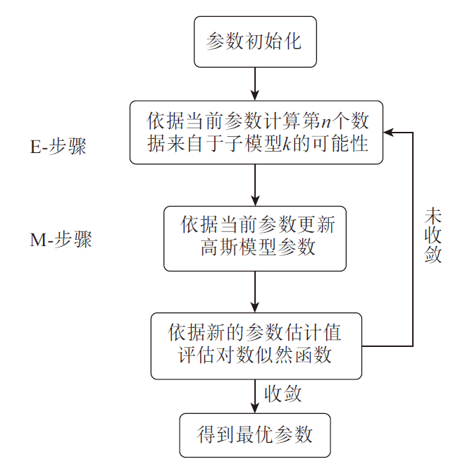 通常用EM算法估计高斯混合模型参数。估计步骤为迭代过程,收敛条件为对数似然函数变化小于ε。EM算法流程如图8所示。
