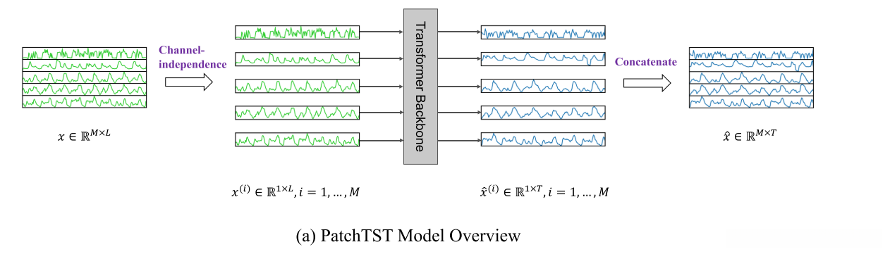 很多Transformer-based模型采用了channel-mixing的方式,指的是,对于多元时间序列(相当于多通道信号) ,直接将时间序列的所有维度形成的向量投影到嵌入空间以混合多个通道的信息。Channel-independence意味着每个输入token只包含来自单个通道的信息。本文就采用了Channel-independence,DLinear中也采用了这种方式。