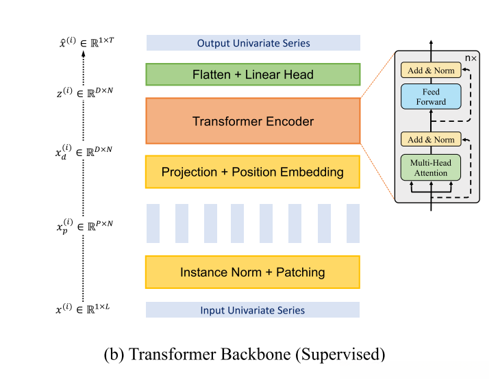 如上图,本文将多元时间序列(维度为 MM )中每一维单独进行处理,即将每一维分别输入到Transformer Backbone中,将所得预测结果再沿维度方向拼接起来。这相当于将不同维度视为独立的,但embedding和Transformer的权重在各个维度是共享的。这样的话,每个Transformer Backbone只需要处理单变量序列。