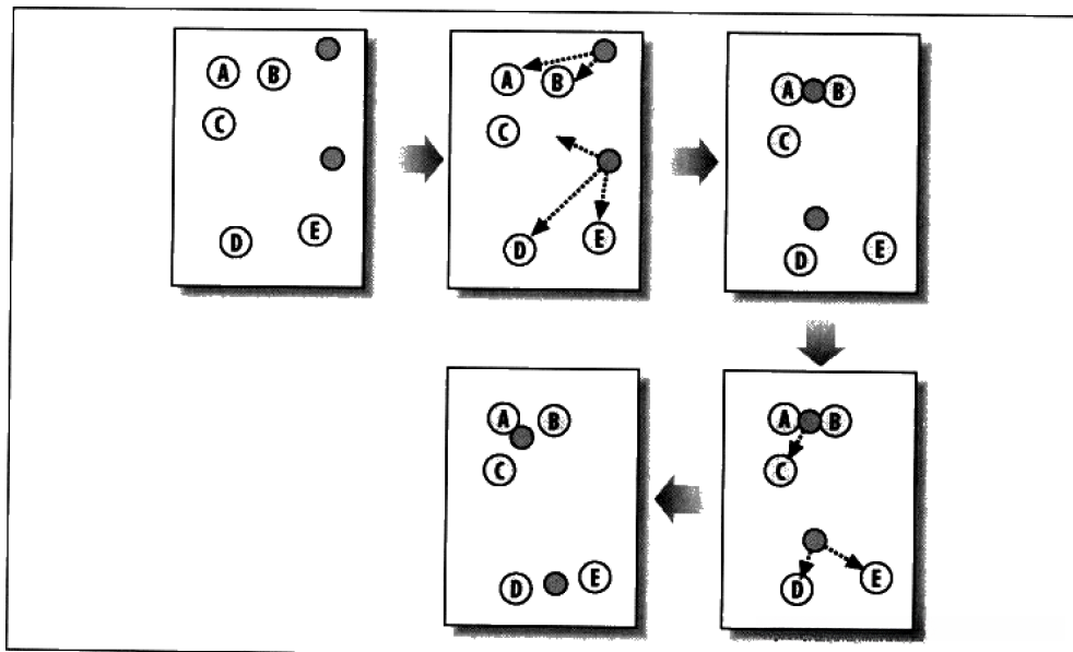 该算法的思路相对简单:即首先随机设定k个基准点;然后遍历原图的所有顶点,并将每个顶点归类到这k个基准点之一;最后并重新计算这k个基准点的位置(通常取其中心位置)。