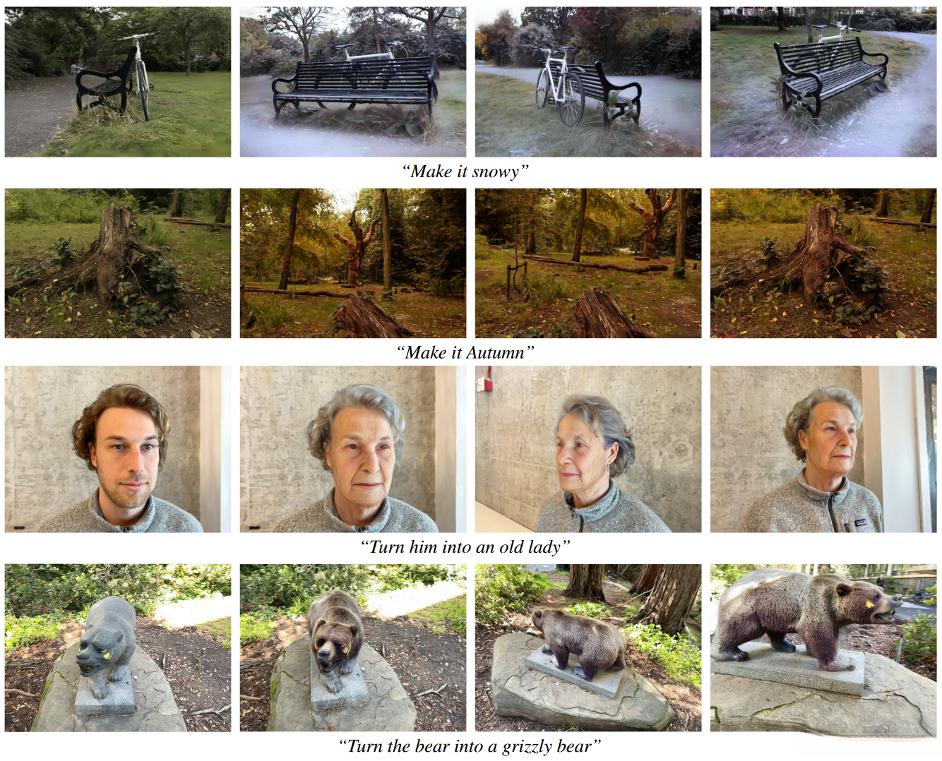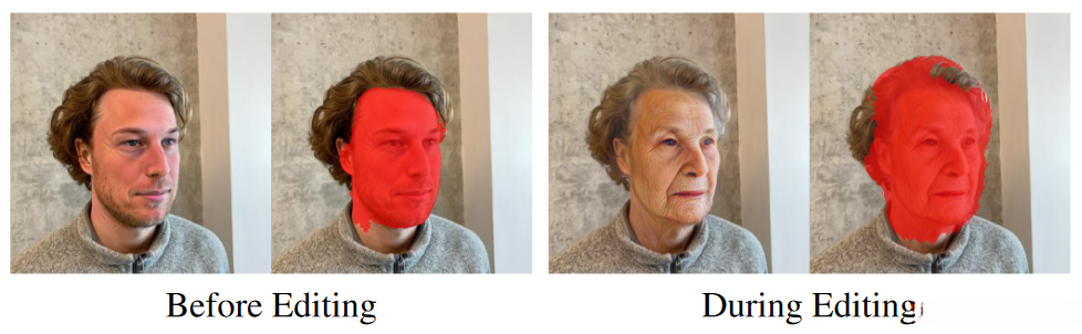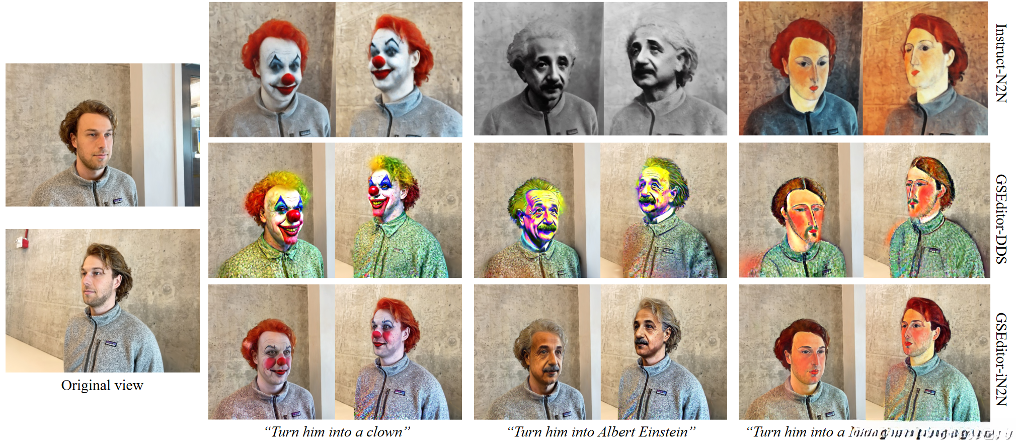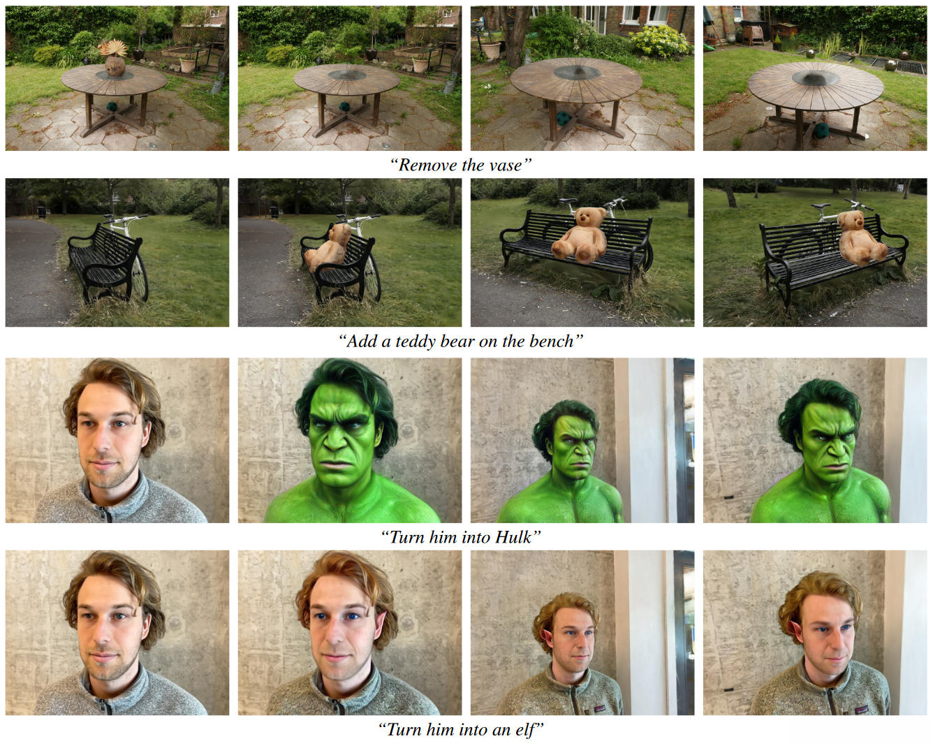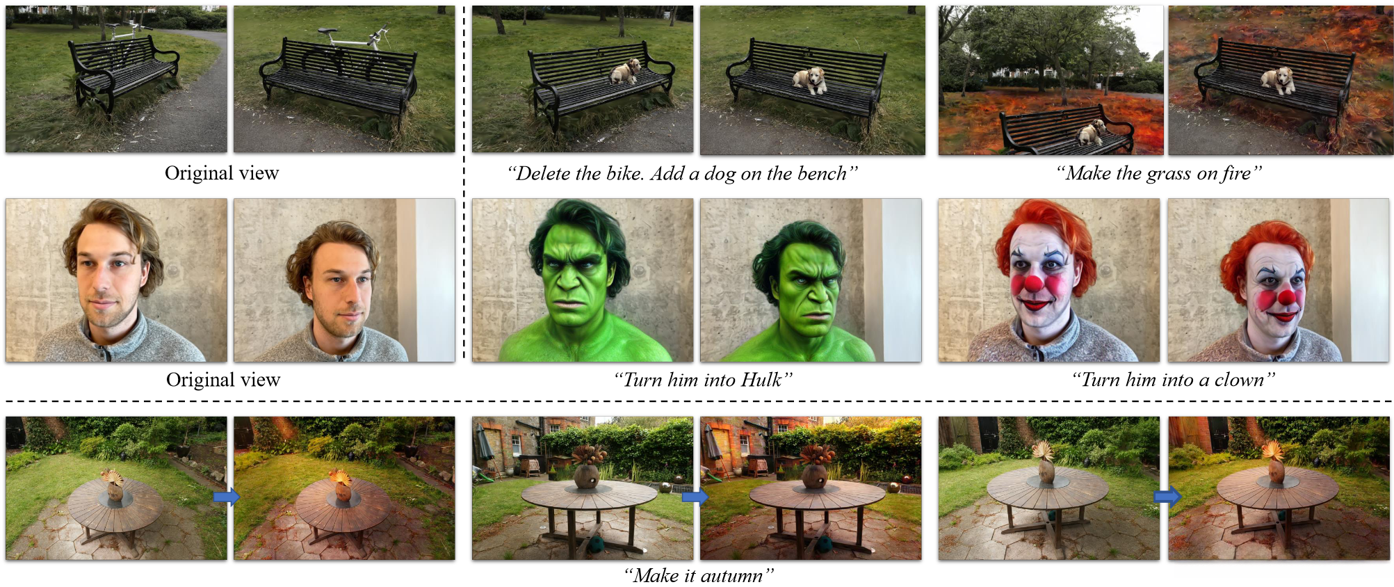 Our method is capable of various editing tasks, including face and scene editing. In face and bear editing, we restrict the editing area to the face using Gaussian semantic tracing, ensuring that undesired areas remain unchanged. The leftmost column demonstrates the original view, while the right three columns show the images after editing.