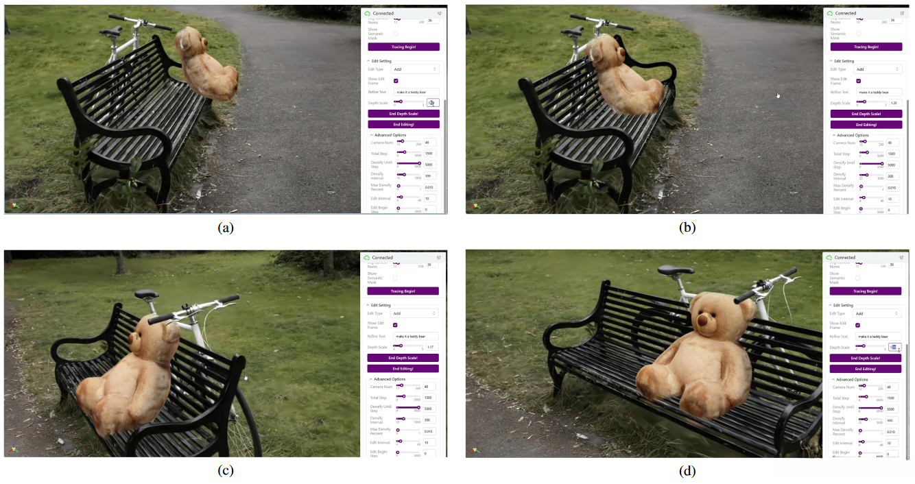 Empowered by our interactive WebUI, the depth scale addresses the limitation of monocular depth estimation, which cannot guarantee precise depth map predictions. As can be seen in (a), inaccurate results can lead to failures when aligning generated objects with Gaussian scenes. We leverage the interactive nature of our WebUI to dynamically adjust the estimated depth in real-time, thus resolving this issue, demonstrated in other images.