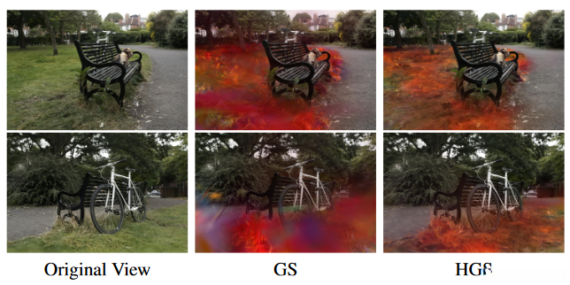 Without HGS, Gaussians tend to conform to this whole-image editing by spreading and densifying across the entire scene, leading to uncontrollable densification and blurring of the image.