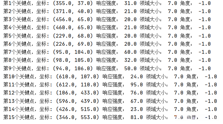 print("第%s个关键点,坐标:"%(n+1),p.pt,'响应强度:',p.response,'领域大小:',p.size,'角度:',p.angle)