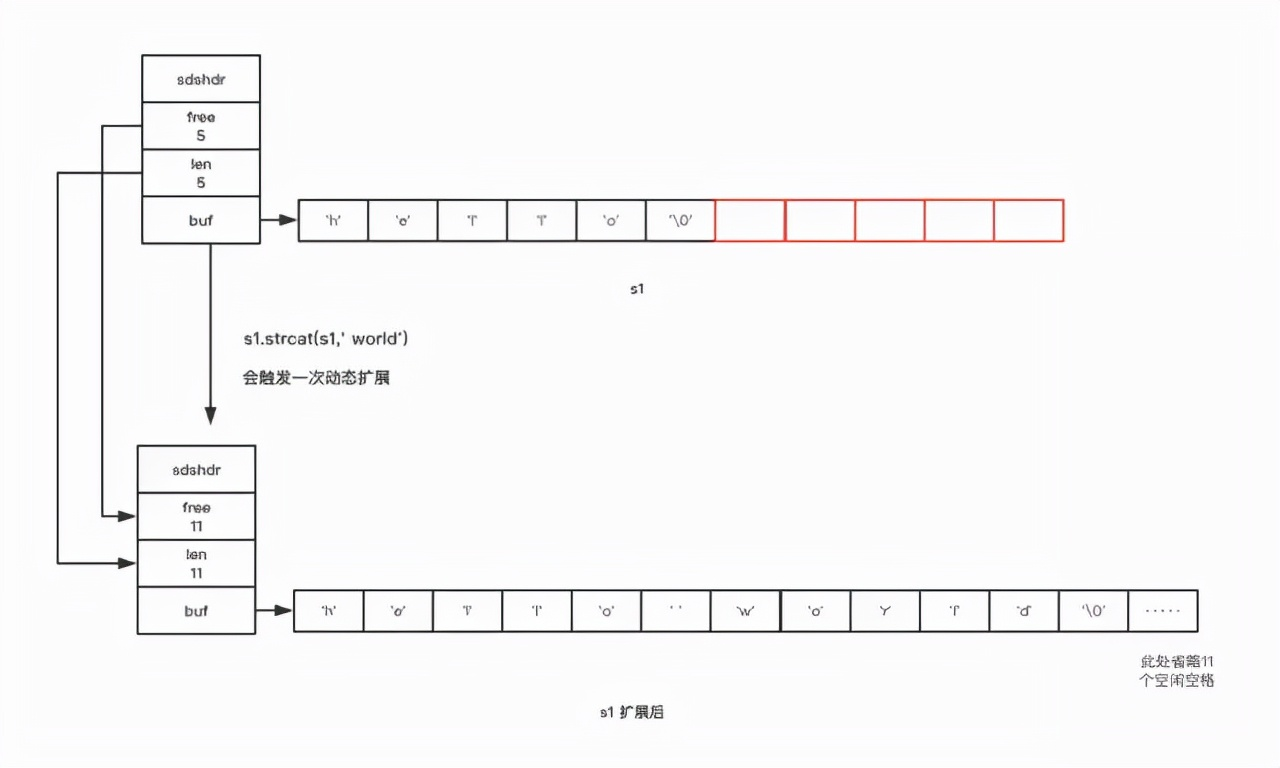 与此相反,在处理字符串缩减时惰性空间回收同样适用。例如考虑一个字符串s1="hello world"。当我们对其执行sdstrim(s1," world")操作后Redis系统不会立即释放被缩减的部分空间;相反会将这些空间供其他需要内存处理的任务使用。然而Redis还提供了一个API让用户自行释放被缩减的部分内存空间以优化资源利用。