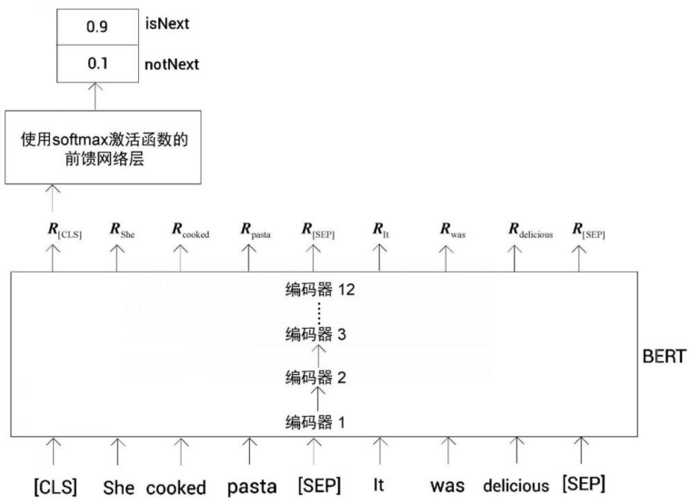 下一句预测任务:将带有[CLS]标记的所有单词特征输入到一个带有softmax激活函数的前馈神经网络层中,并根据输出结果分别计算isNext和notNext两类的概率预测值