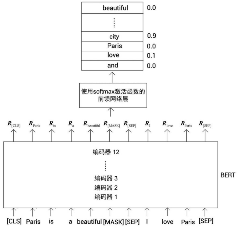 例如,在一次预测中发现BERT模型对[MASK]被预测为'城市'的概率值最高。