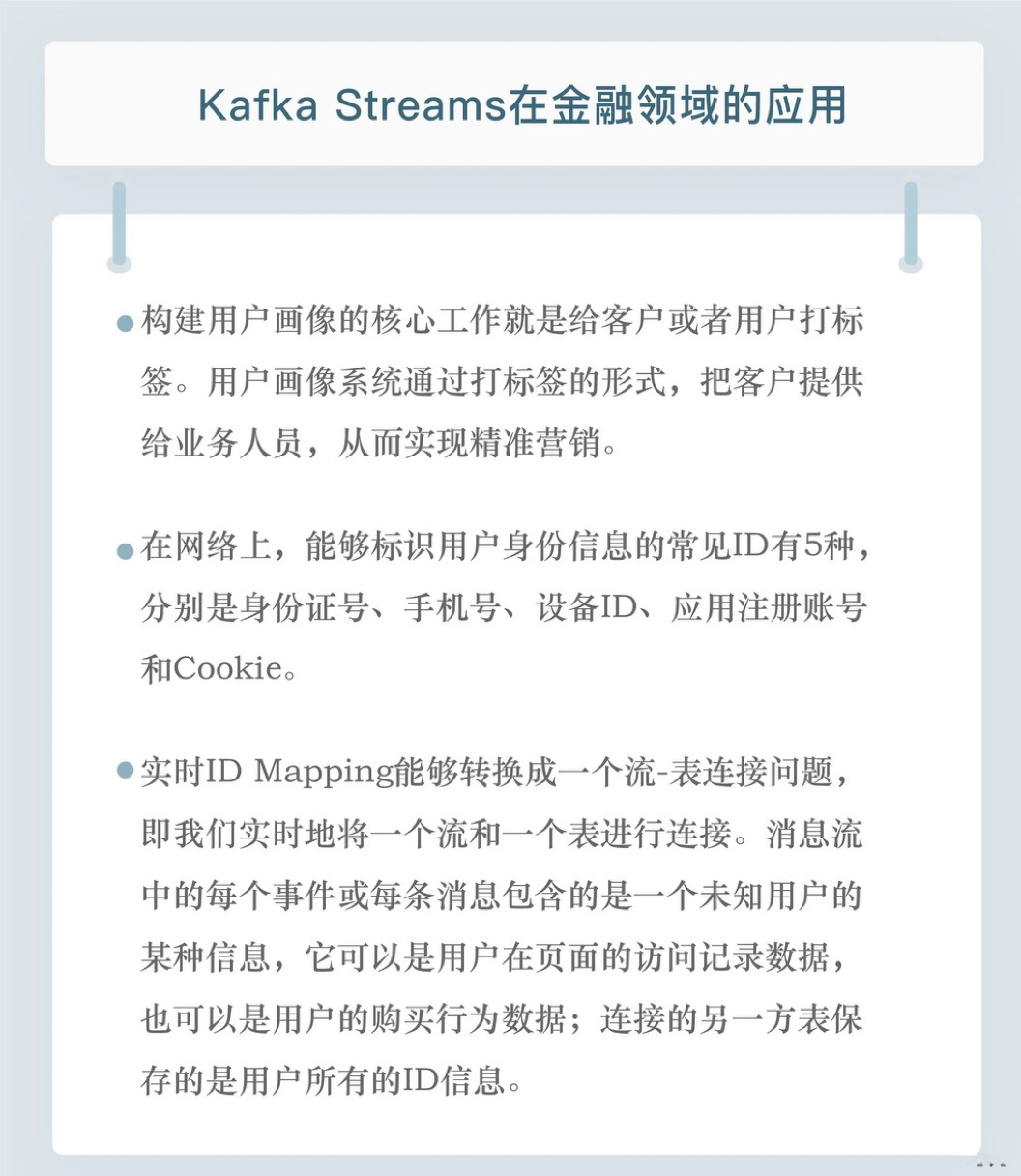 Kafka Streams在金融领域的应用案例充分突显了其在实时计算方面的强大功能。借助实时ID Mapping技术, 金融企业可实现客户生命周期价值的最大化, 同时有效降低获客成本并推动精细化运营。本文详细阐述了使用Kafka Streams实现实时ID Mapping的具体实施步骤, 包括构建数据表和数据流, 实现流与表之间的连接等关键步骤。通过简洁而高效的Java代码, 清晰展示了如何利用Kafka Streams快速实现实时ID Mapping任务的过程。综上所述, Kafka Streams在金融领域的应用为企业提供了一种强大的实时计算解决方案, 帮助企业在精准识别客户需求方面取得显著成效, 并实现了客户的长期价值最大化