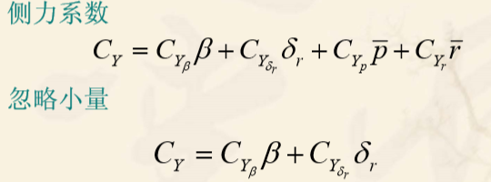 滚转角 产生的侧力:大小等于气动力对滚转角速度的导数QSwp平均。其中p平均是对滚转角速度进行了归一化处理之后的值,归一化的计算公式有苏式和欧美的差别,角速度展长(有时是弦长)/V(2V)