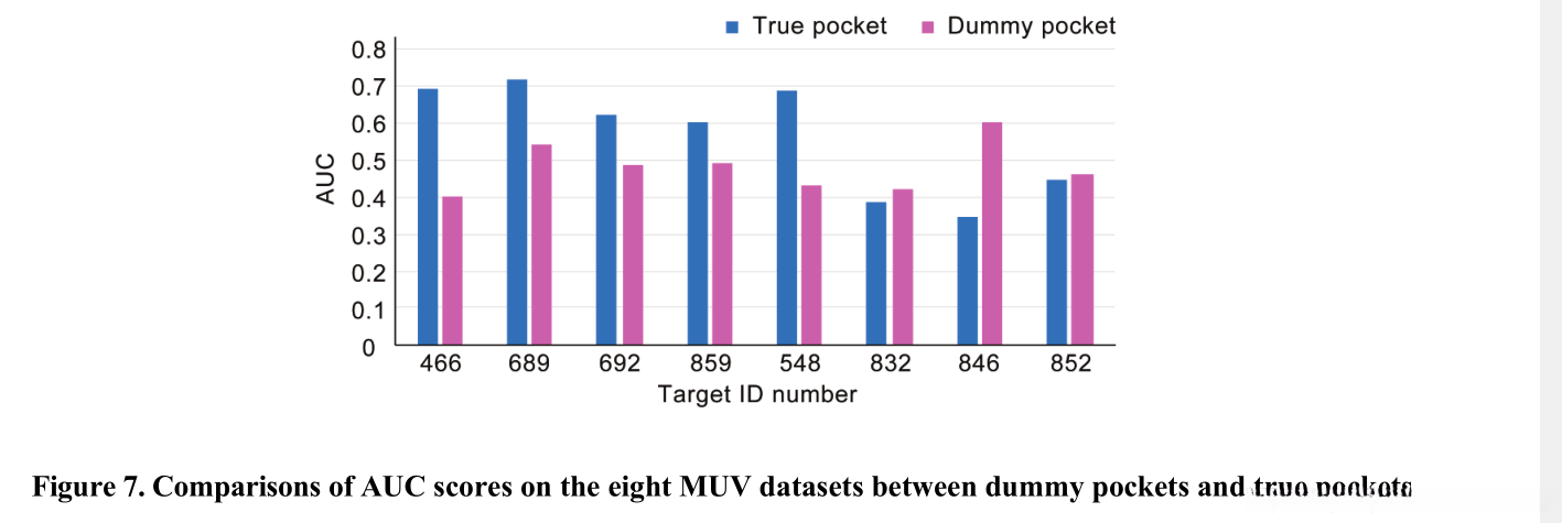 MUV数据集上将正确的口袋换成假的,测试模型是否有学习到口袋信息,然后发现后面3个数据用了假口袋还提升了性能。说明正确口袋信息齐了负作用