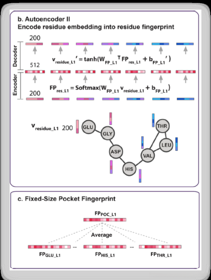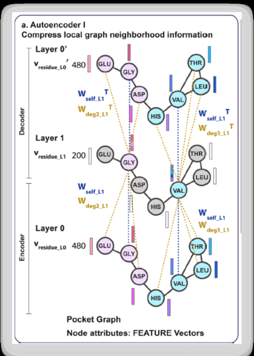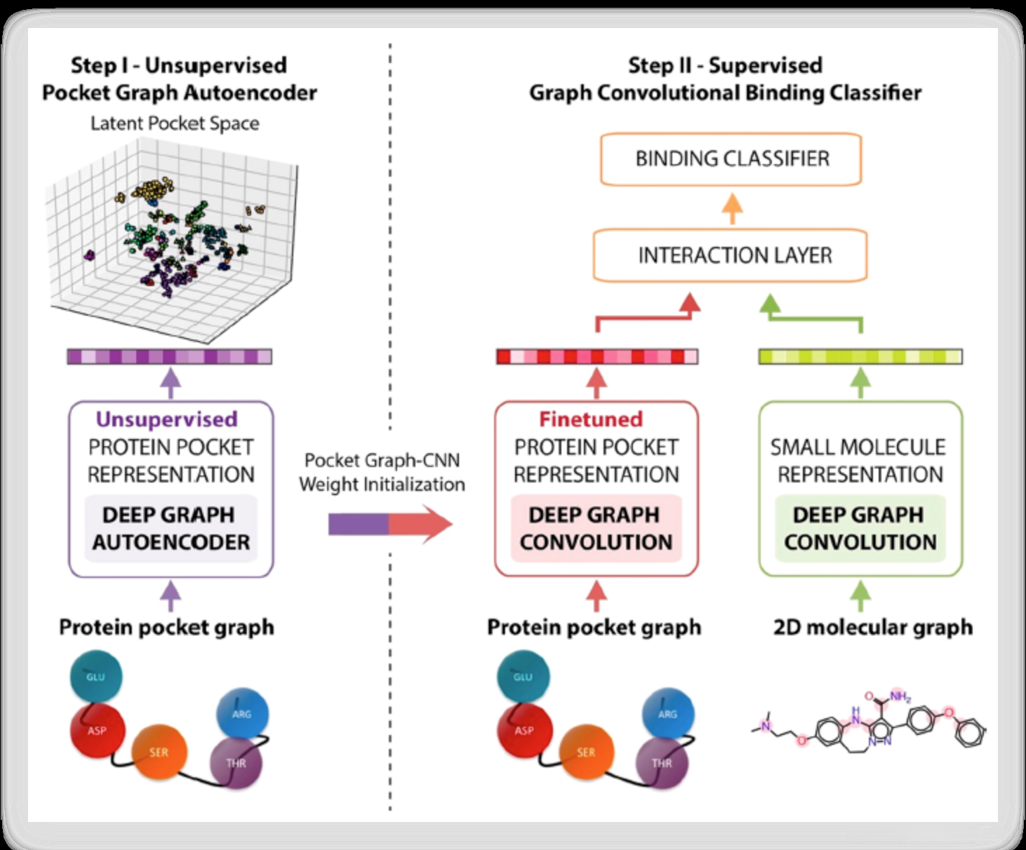 - 无监督的口袋图自编码器在具有代表性的可放置药物的口袋用来学习一般的口袋特征并将蛋白质口袋嵌入固定大小的潜在空间中。