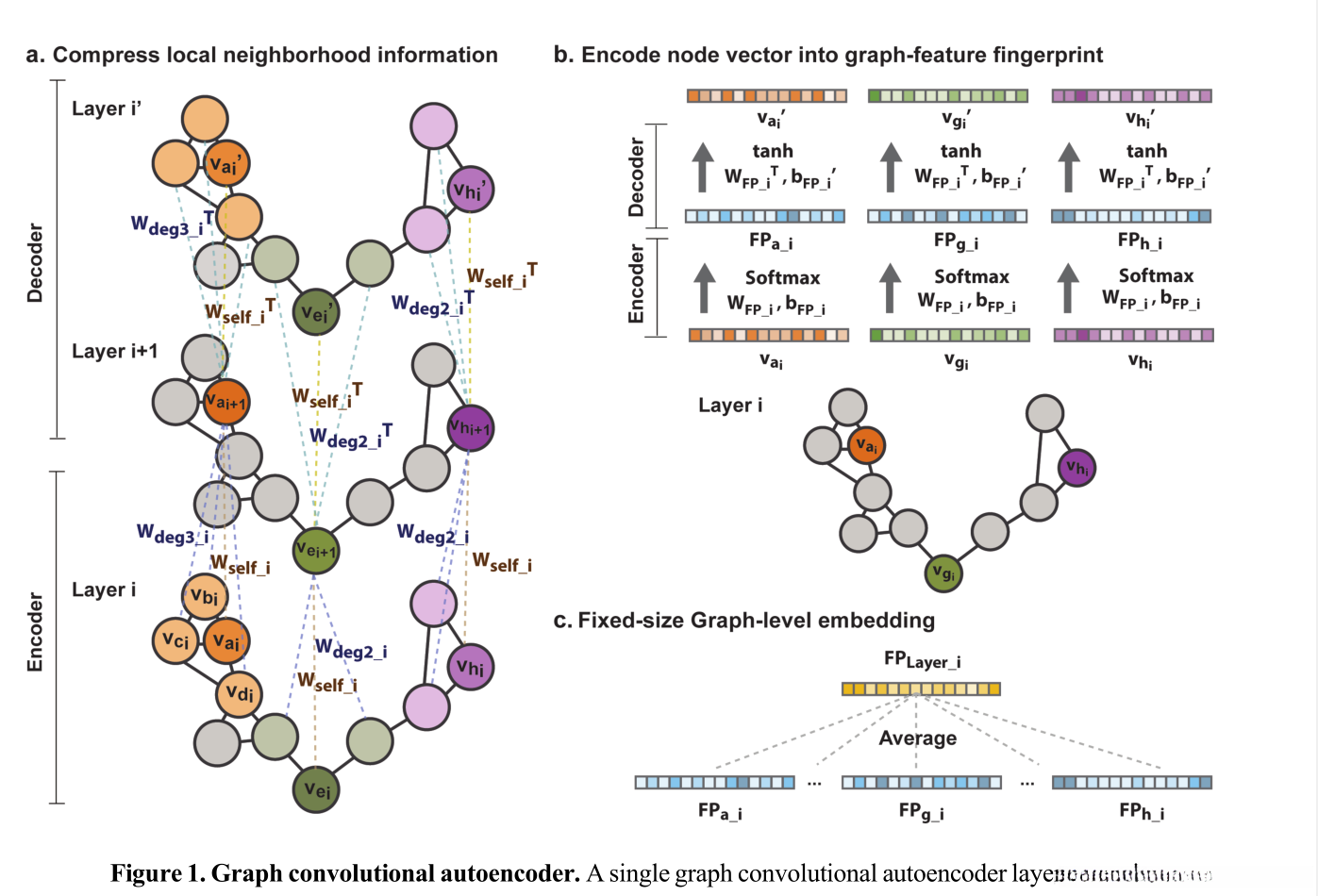 1. 使用Duvenaud的方法,使用图卷积运算将自编码器用到graph上,图卷积自编码器包括两个自编码器: