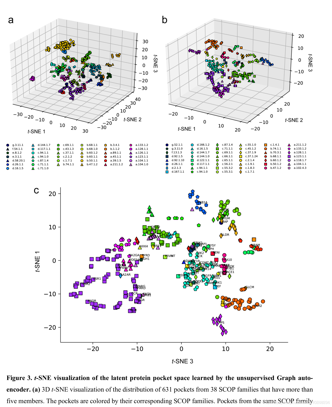 - 使用t-SNE分别降维到2D、3D进行编码器的可视化,使用SCOP进行相近颜色的标注。