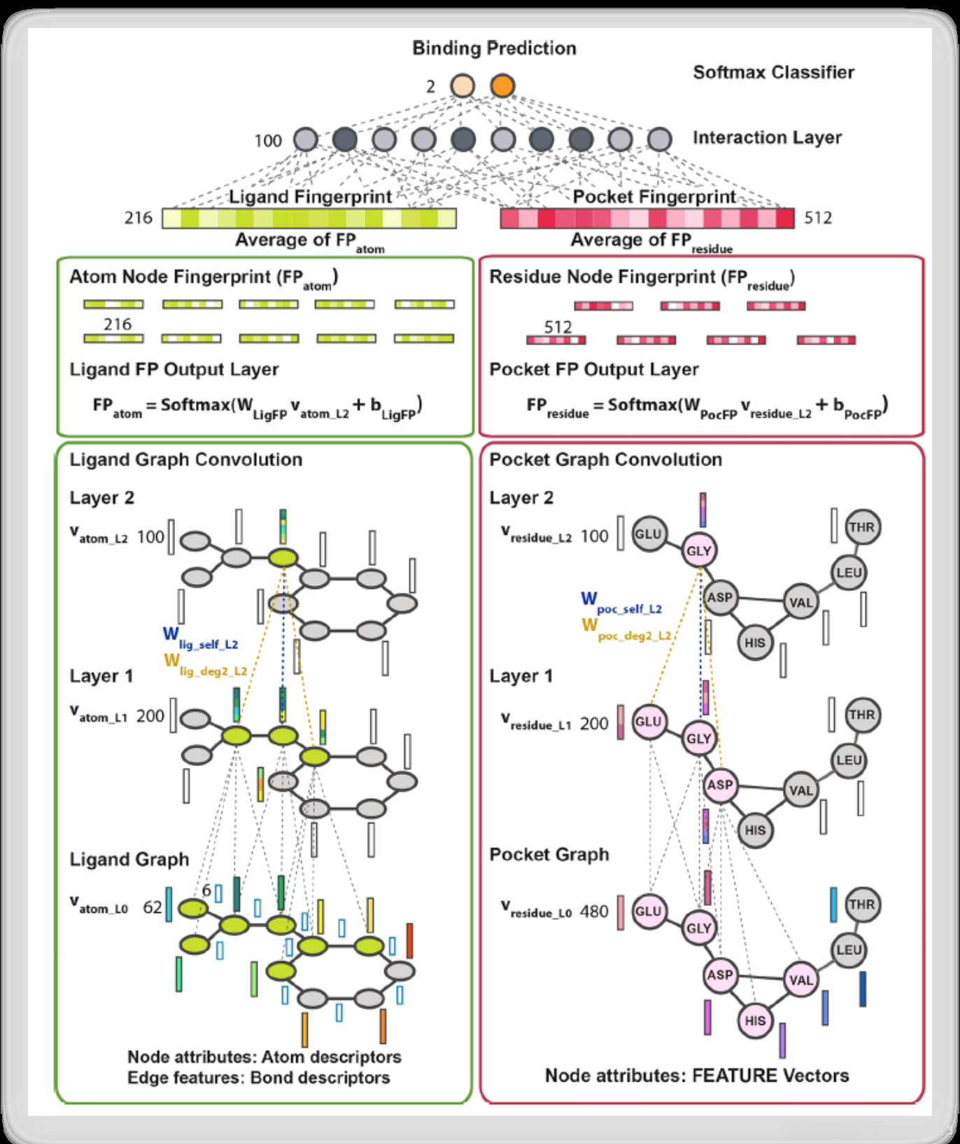 - 构造了一个Pocket Graph-CNN和一个配体Graph-CNN,分别从Pocket图表和2D配体图中提取特征。允许网络以识别各种口袋特征,口袋Graph-CNN使用步骤1中学习的权重进行初始化。然后,交互层集成了从口袋和配体Graph-CNN中学习到的功能。最后,分类器吸收学习到的交互来执行预测。