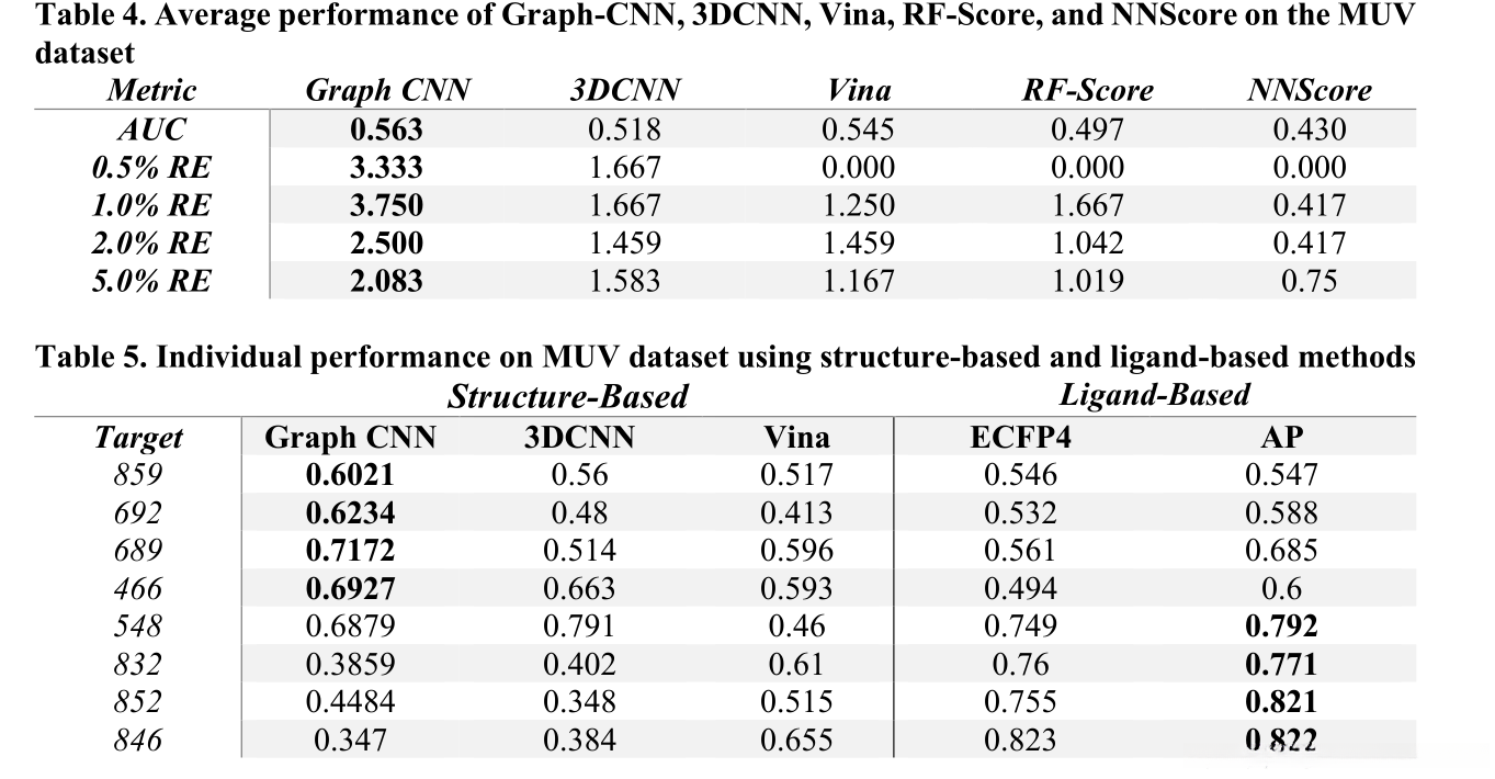 - 评估target-ligand数据集使用MUV数据集,使用AUC和RE metric指标,并与3DCNN protein-ligand scoring,Vina, RF-Score, and NNScore进行比较。
