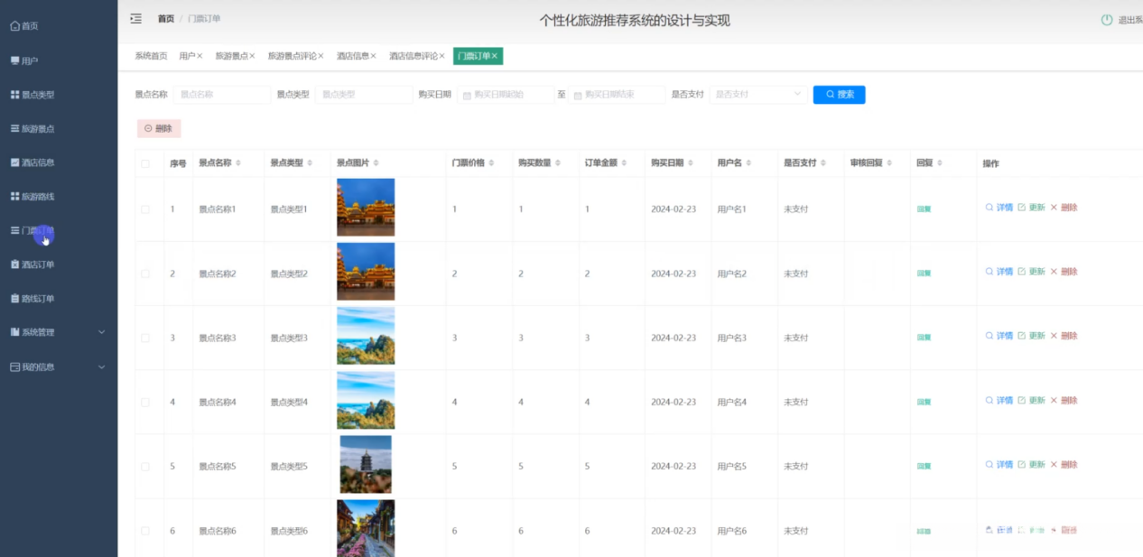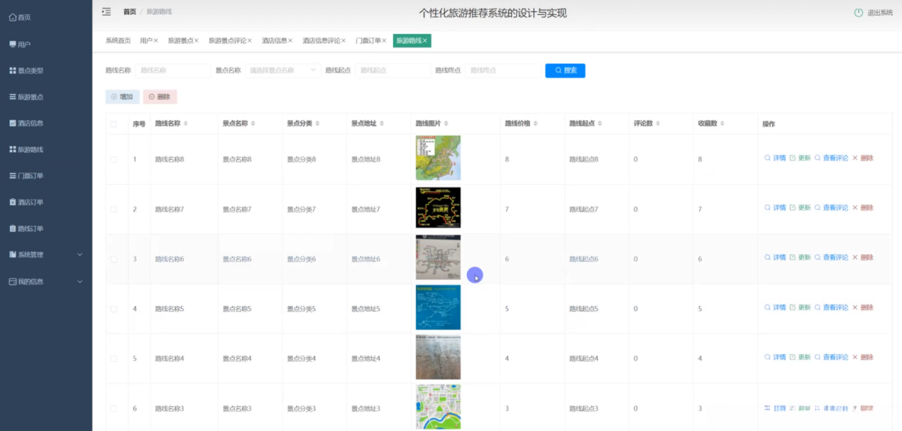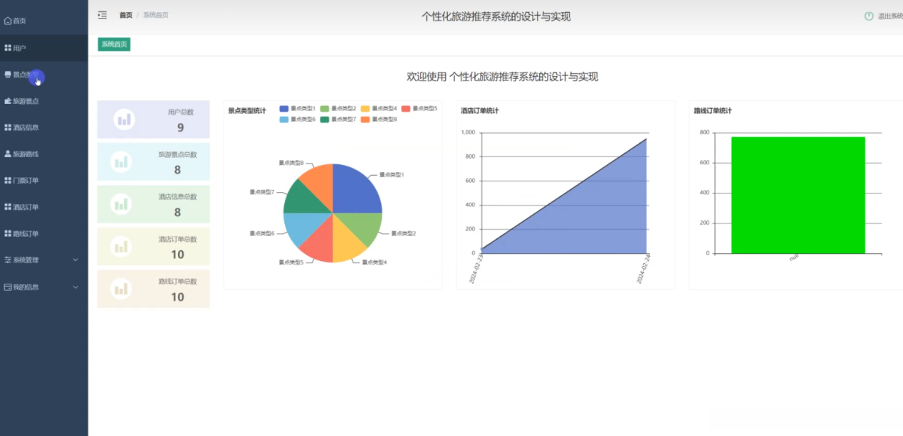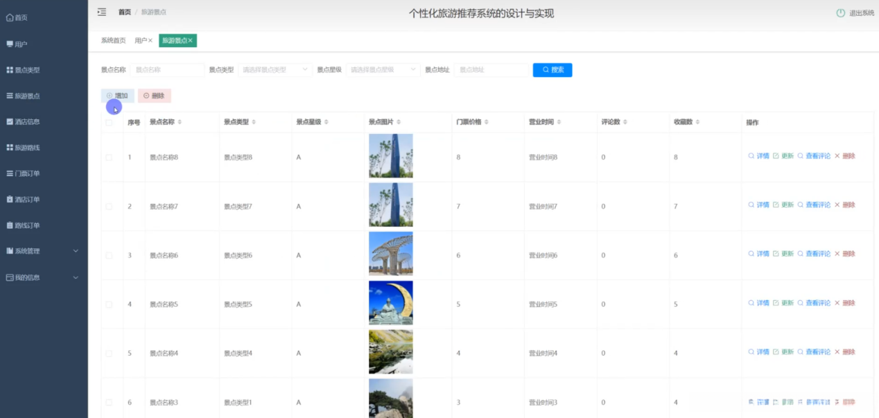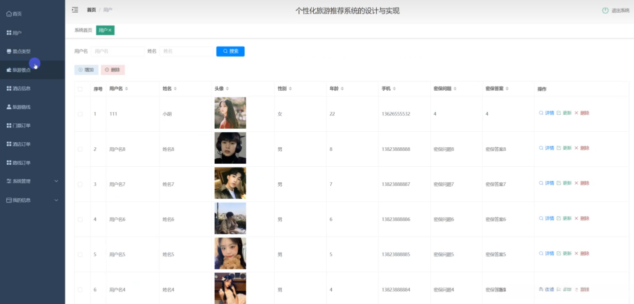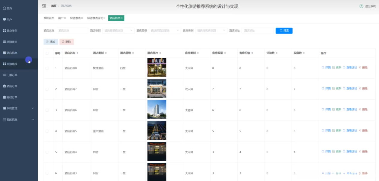 本文首先简要介绍了项目的研宄背景及其国内外发展现状。在此基础上, 对管理员用户的需求进行了分析。然后, 对个性化旅游推荐系统的功能需求进行了详细分析。最终确定了个性化旅游推荐系统的核心功能需求。为了满足管理员的需求, 确定了管理员需要管理的内容, 包括用户信息、景点类型等。针对酒店信息的增删改查功能, 制定了相应的操作规范。本系统通过互联网实现了高效的协同, 使得多个用户能够同时查询并获取个性化的旅游推荐方案。