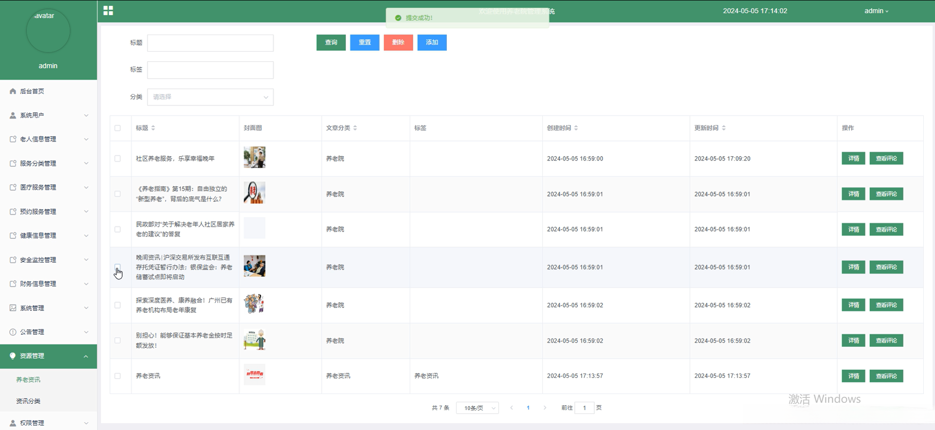 资源管理:管理员在资源管理界面可添加、删除、修改养老资讯和资讯分类信息。如图4-10所示。