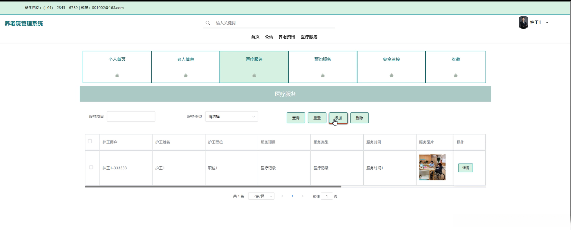 医疗服务,护工用户在医疗服务界面可以进行添加、删除、修改医疗服务信息等操作,如图4-5所示。