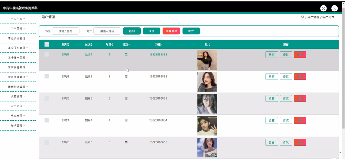 管理员可在用户管理页面查看注册账号及相关信息内容包括但不限于:注册账号名称(用户名)、个人基本资料(年龄 性別)、个人头像(照片)以及手机号码等详细信息,并根据实际需求完成新增建立完善修改更新或删除缩减等常规操作如图5-9所示