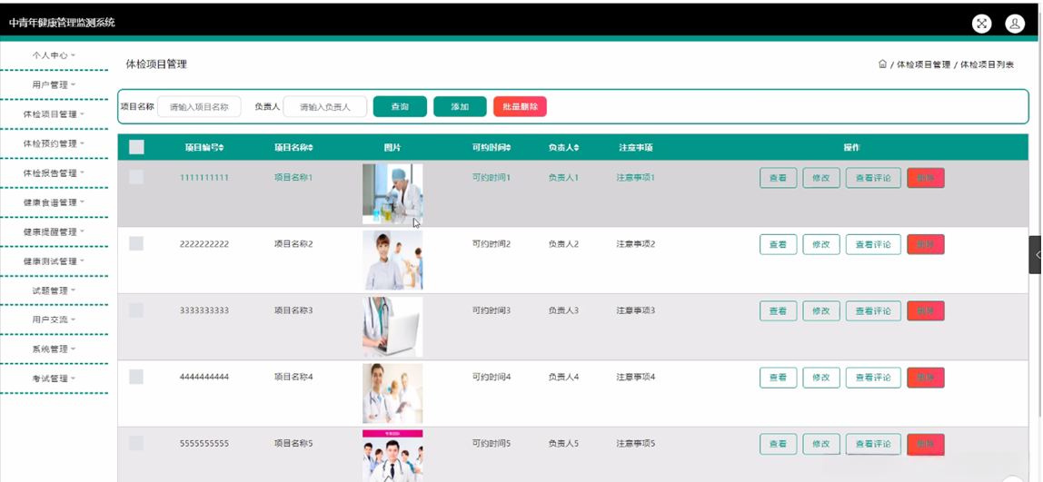 体检项目的整体管理中, 管理人员可在 dedicated 的体检项目管理界面内查询到 项目编号, 项目名称, 相关图片资料, 预约时间安排, 负责人的详细信息以及注意事项等多个具体要素. 此外, 该平台还提供了丰富的功能选项, 包括新增项, 编辑项, 查看评论信息以及执行删除操作等服务. 如图5-10所示为具体的操作界面展示.
