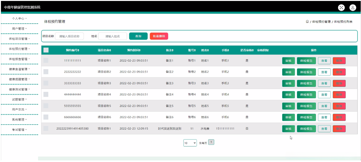 在体检预约管理页面上, 管理员可以查看约定期刊编号, 项目名称, 预约时间, 备注, 账号, 姓名, 手机号码以及是否待审核状态和审核结果等内容。并可据此需求执行审核或删除等操作。如图5-12所示