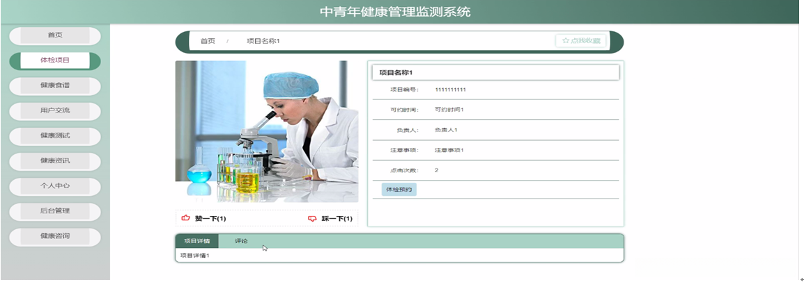 在体检项目页面中显示的相关体检信息中包含:项目的名称及编号、可预约的时间段以及相关信息的负责人;此外还提供了参与人数以及用户的点赞和踩踏行为等数据统计内容;此外用户还可以进行体检预约操作流程如下:预约成功后即可直接进入详情页面查看结果等详细操作步骤;如图5-2所示