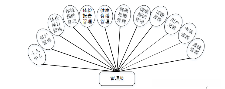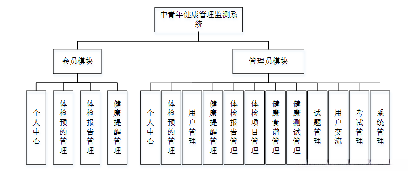 基于市场调研与专业咨询分析的基础上, 握住了中青年健康管理监测系统的实际使用痛点, 进而规划了包含管理员、主席等核心模块在内的系统架构设计。功能架构图如图4-1所示: