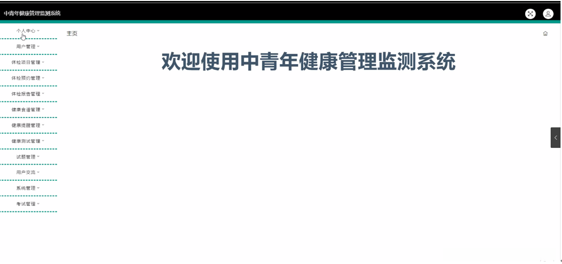 管理员登录进入中青年健康管理监测系统后可查看个人档案管理模块、用户信息管理模块、体检指标管理模块、体检安排管理模块、体检报告生成模块、健康食谱规划模块以及健康预警通知模块,并可进行详细操作(如图5-8所示)。
