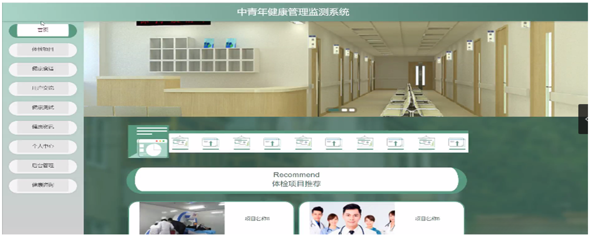 HomePage allows users to browse a variety of health-related features such as home pages, exercise menus, dietary plans, user interactions, health assessments, news updates and personal sections for operation as shown in Figure 5-1.