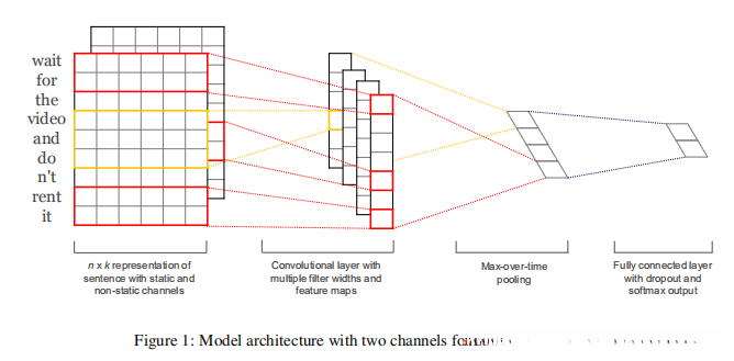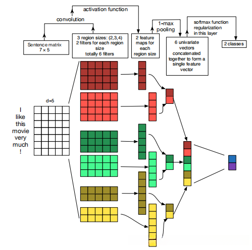 上图生动地展示了模型的整体架构。考虑给定一组待分类的句子,请注意其中每个词都是由n维词向量构成的;因此输入矩阵的规模设定为m*n ,其中m代表句子长度。卷积网络对输入样本执行卷积操作,在文本处理中滤波器并非横向滑动而是垂直向下移动(类似于N-gram提取局部相关性)。该图列出了三种不同的步长策略:2、3、4步长;每种步长配置下均配置两个滤波器(实际训练时滤波器数量会显著增加)。在不同窗口大小下应用不同滤波器后将产生6个卷积后的向量特征;随后对每个特征向量实施最大值池化操作并整合各池化结果最终生成该句的表征向量;将此向量传递至分类器完成识别任务。