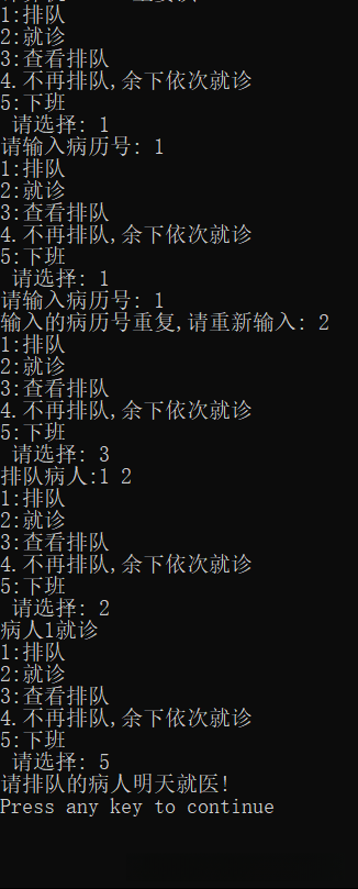 printf("1:排队\n2:就诊\n3:查看排队\n4.不再排队,余下依次就诊\n5:下班\n 请选择: ");