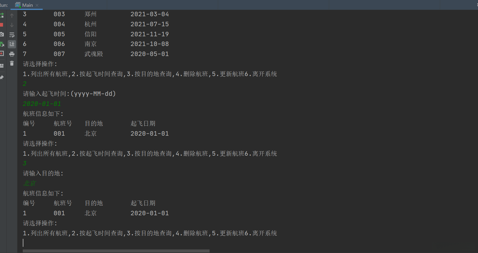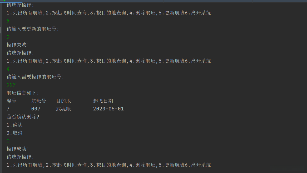 * @return 1.列出所有航班,2.按起飞时间查询,3.按目的地查询,4.删除航班,5.更新航班6.离开系统