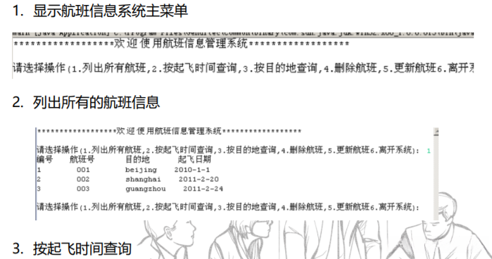 System.out.println("1.列出所有航班,2.按起飞时间查询,3.按目的地查询,4.删除航班,5.更新航班6.离开系统");