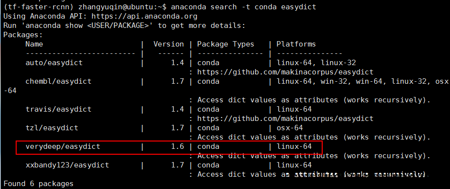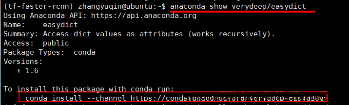 使用命令 anaconda show verydeep/easydict 查找安装地址