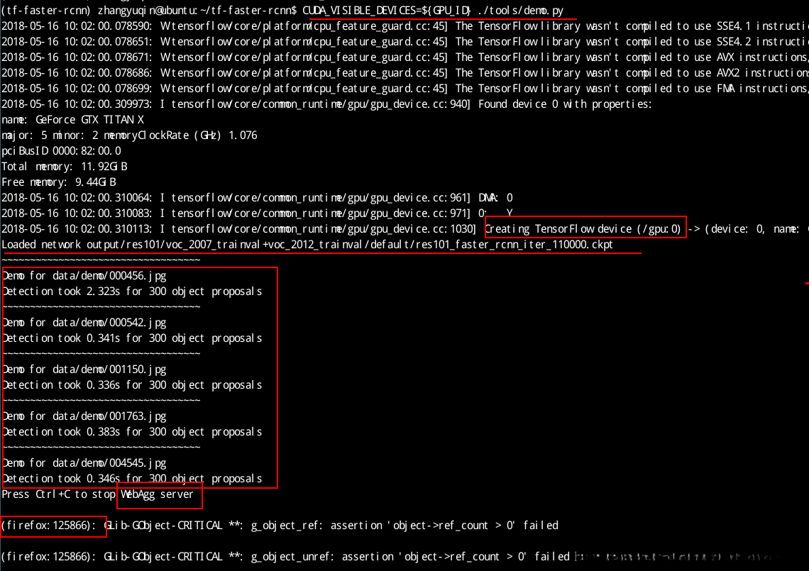 - 运行以下代码就能测试demo了,注意是在tf-faster-rcnn 这个根文件夹中运行